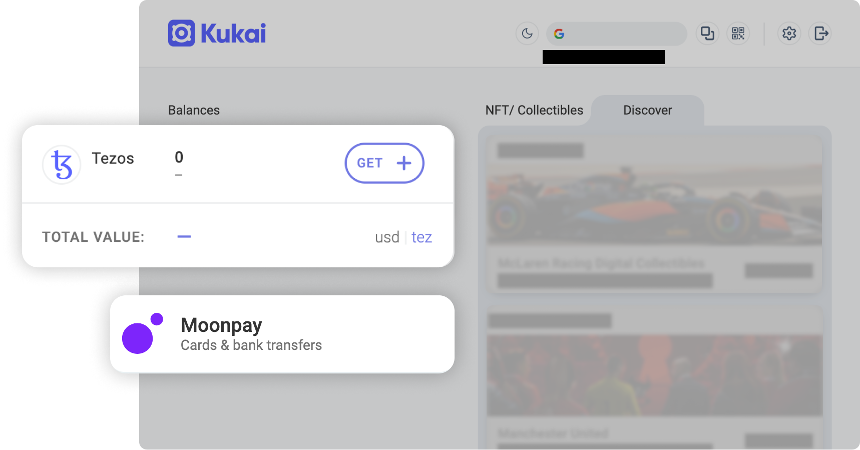 To collect artwork or other digital collectibles on Tezos you will need to fund your Kukai wallet with tez, the currency of the Tezos blockchain. To do this, click on the plus sign in the balances bar of the Kukai Wallet. Then click on Moonpay to fund your wallet with credit card or a bank transfer. It’s as easy as setting up a traditional account!