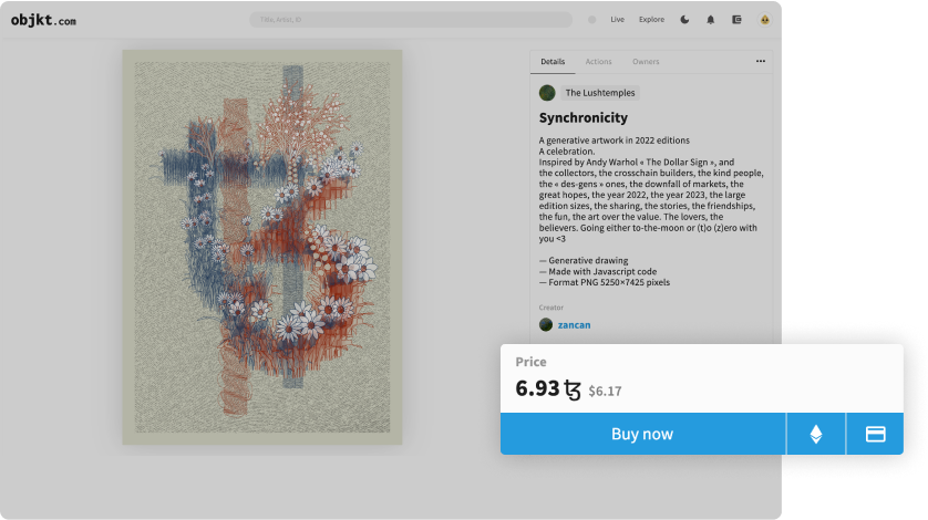 Once you have signed the agreement to sync your wallet to Objkt.com, you have unlocked the power to collect artwork that is linked to your digital account. This link between the source of the digital asset and prospective collectors is what allows for validated provenance of artwork through the course of its history on the blockchain.