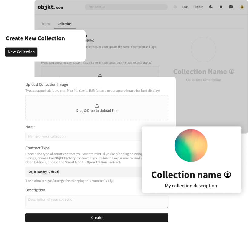 To create a new unique work or collection on Objkt, click “Create Collection” - Collections define the scope of your artwork, whether a single piece, a group of different works, or an edition of a single piece. Your first step is to upload a cover image for your collection - this can be identical to one of the artworks in the collection - or symbolic of them like an album cover.
