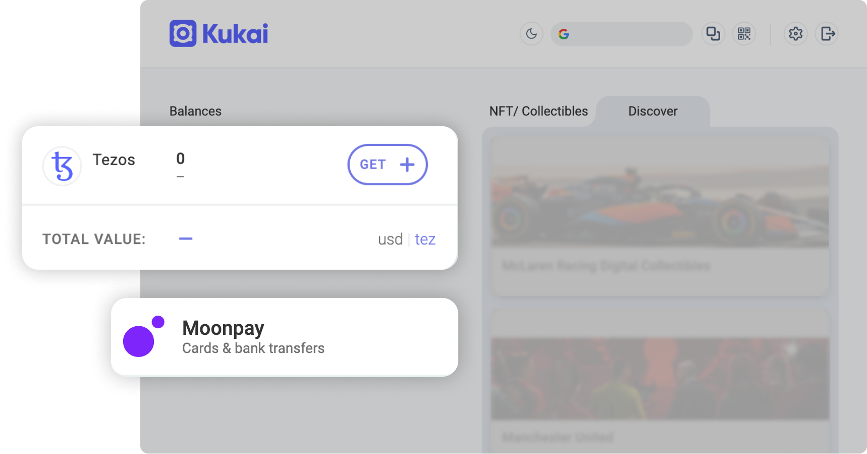 To mint your artwork or a collection of artworks, you will need to fund your Kukai wallet with tez, the currency of the Tezos blockchain. To do this, click on the plus sign in the balances bar of the Kukai Wallet. Then click on Moonpay to fund your wallet with credit card or a bank transfer.