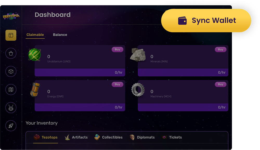 First, navigate to the Tezotopia website and click Sync wallet in the upper right corner.
